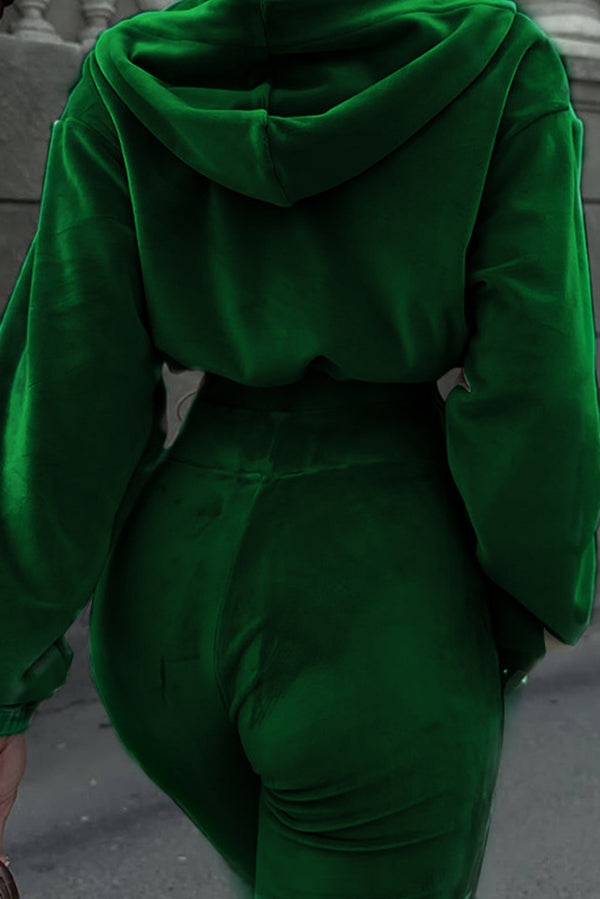 Solid Color Velvet Casual Hooded Zip-up Top and Elastic Waist Flared Pants Set