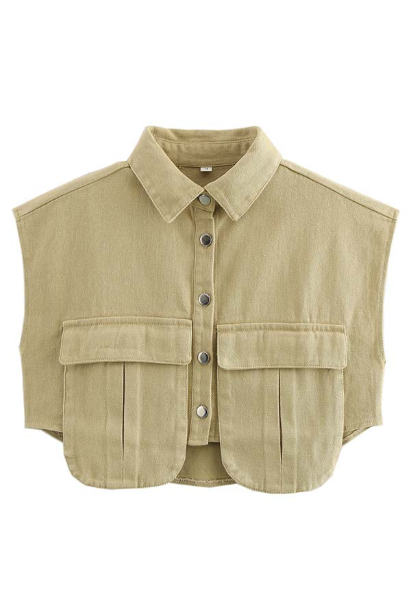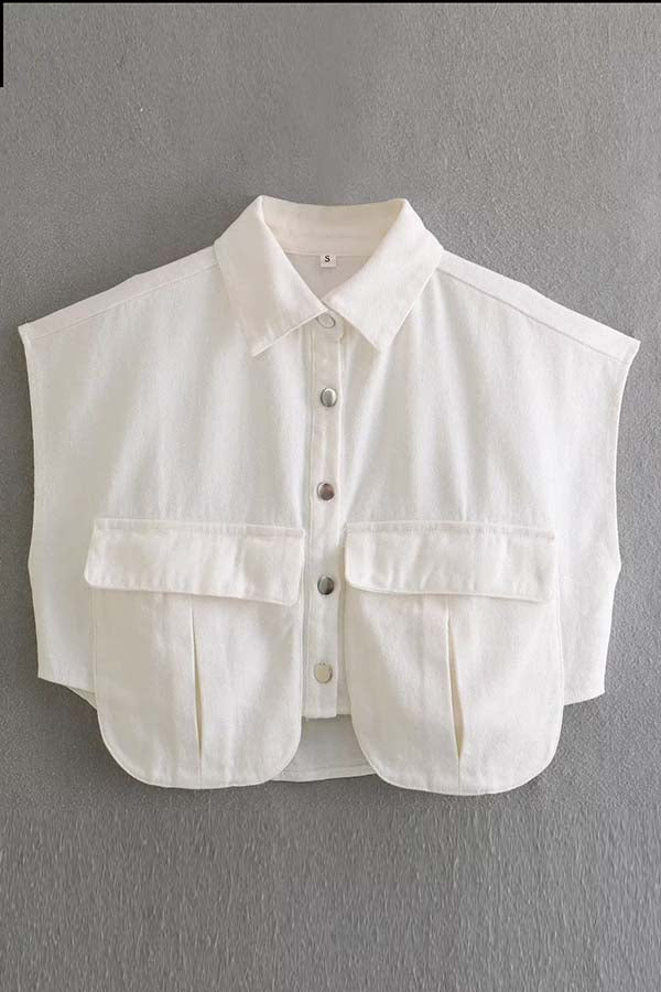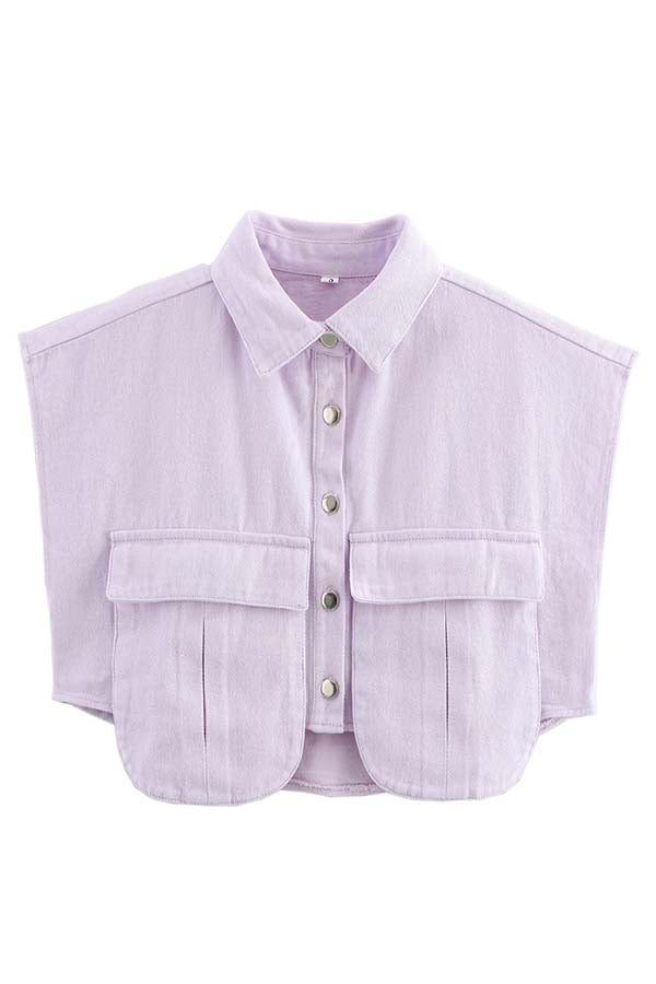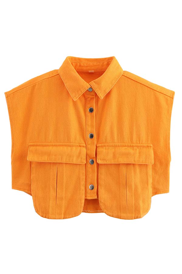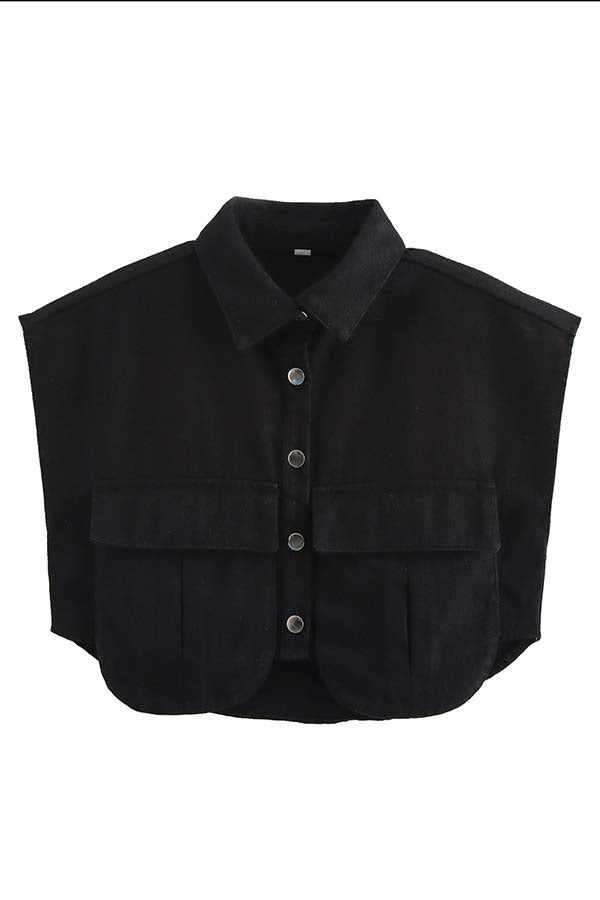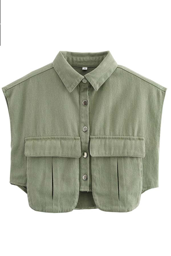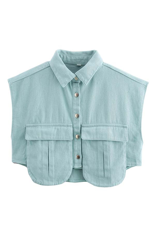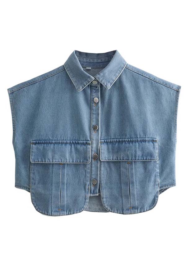 Stylish Weekend Denim Button Up Cape Sleeve Pocket Crop Top