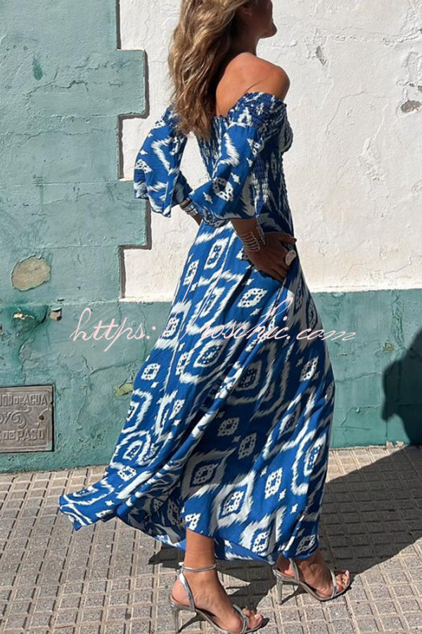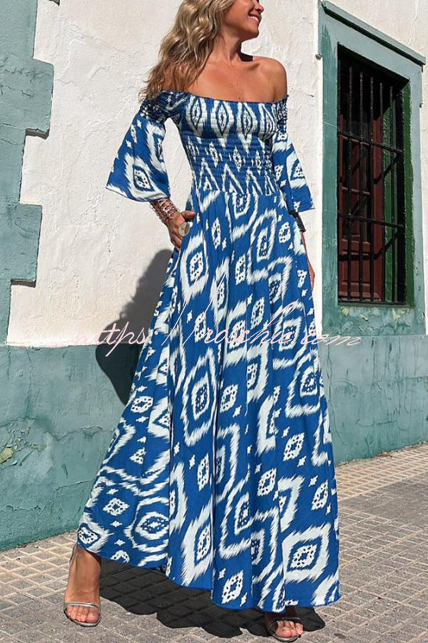 Close To The Vacation Ethnic Print Smocked Off Shoulder Pocketed Maxi Dress